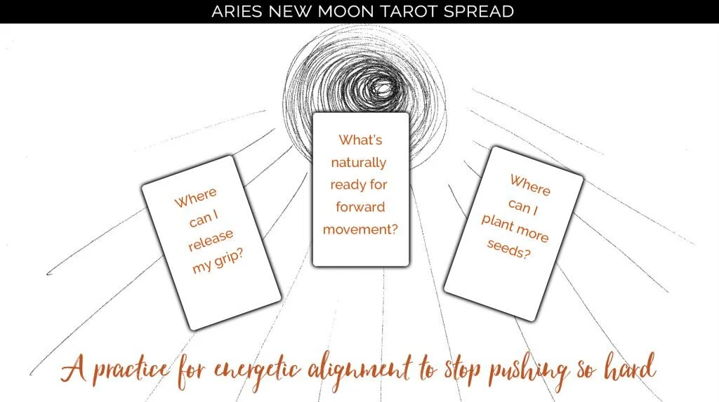 Calling on a variety of those aspects, I developed this Aries New Moon Tarot spread. It resembles a Past-Present-Future layout but relies more on the momentum that's building with Spring.
