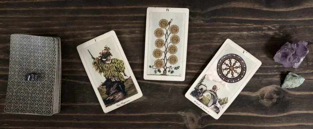For this spread I shuffle and lay out the cards with Center being card 1, Left is card 2, and right is the third card. The reading really focuses on card 1, the center card.